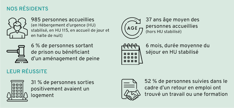 - 985 personnes accueillies (en Hébergement d’urgence (HU) stabilisé, en HU 115, en accueil de jour et en halte de nuit) ;