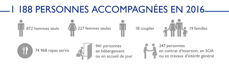 En 2016, l'association a accompagné dans leurs démarches de réinsertion près de 1 200 personnes : essentiellement des hommes et des femmes seuls mais aussi des couples et des familles. Plus de la moitié de ces personnes sortaient de prison ou se trouvaient sous main de justice, si l'on excepte les personnes reçues en accueil de jour ou en hébergement d'urgence à la Passerelle.