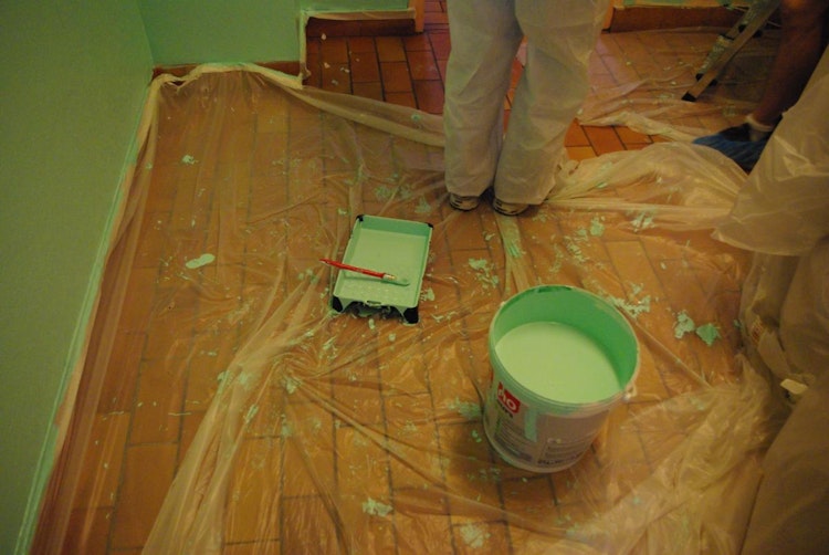 Pause déjeuner bien méritée ensuite, avant de continuer la remise à neuf. L’équipe a ensuite appliqué une seconde couche avant de procéder aux finitions, de débarrasser le chantier et de remettre le mobilier en place.
